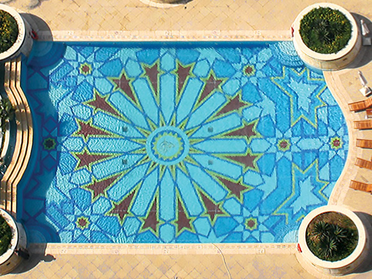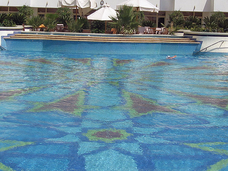In Grand Hyatt Hotel, BISAZZA Glass Mosaic was used in the Main and Children Swimming Pools. It was executed in special and unique Computerized Design.