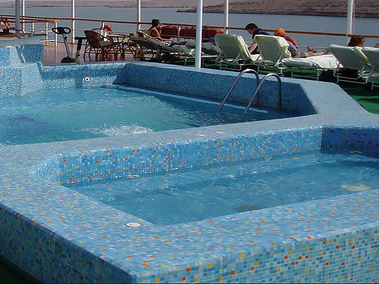 In Prince Abbas Nile Cruise, BISAZZA Glass Mosaic was used for covering the Swimming Pool. BISAZZA's Glass Mosaic is the most suitable finishing material for cruise ships due to its light weight compared to any other finishing material.