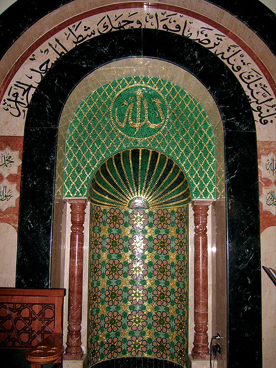 In Police Mosque (Salah Salem), BISAZZA Glass Mosaic was used in making the Facade Decorative Units & Computerized Calligraphy, Minarests, Mehrab & Indoor Handmade Calligraphy. The most luxurious tiles of BISAZZA were used in