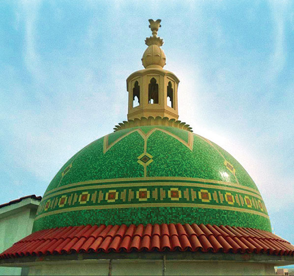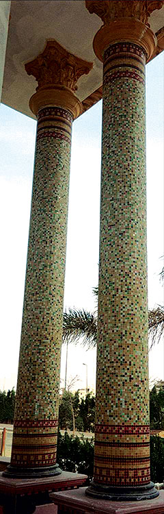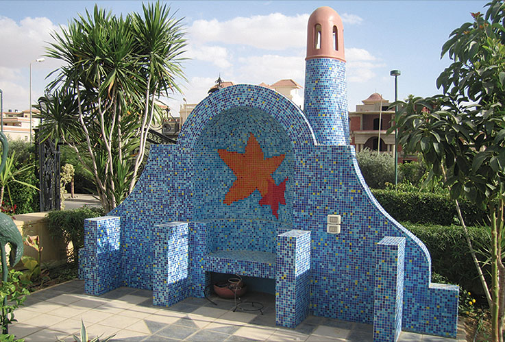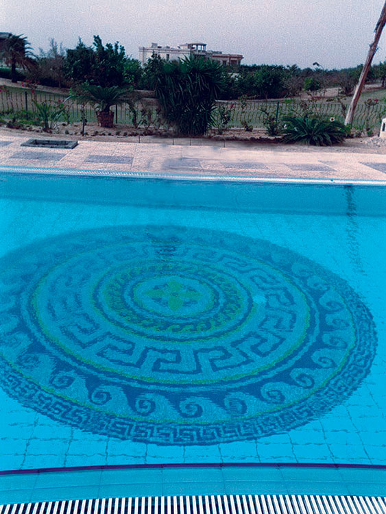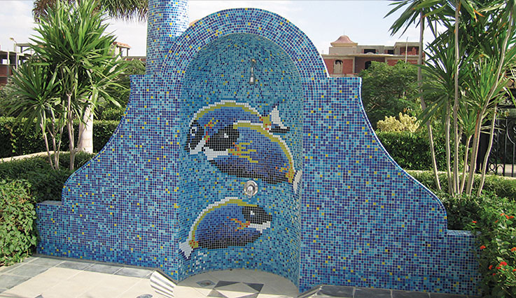 VITRA Ceramic Tiles and BISAZZA Glass Mosaic were used in Swimming Poll. Also, BISAZZA Glass Mosaic was used in Decorating Villa Dome, Facades, Pool Surround, Villa Entrance Pharounic Handmade Panel & Columns.